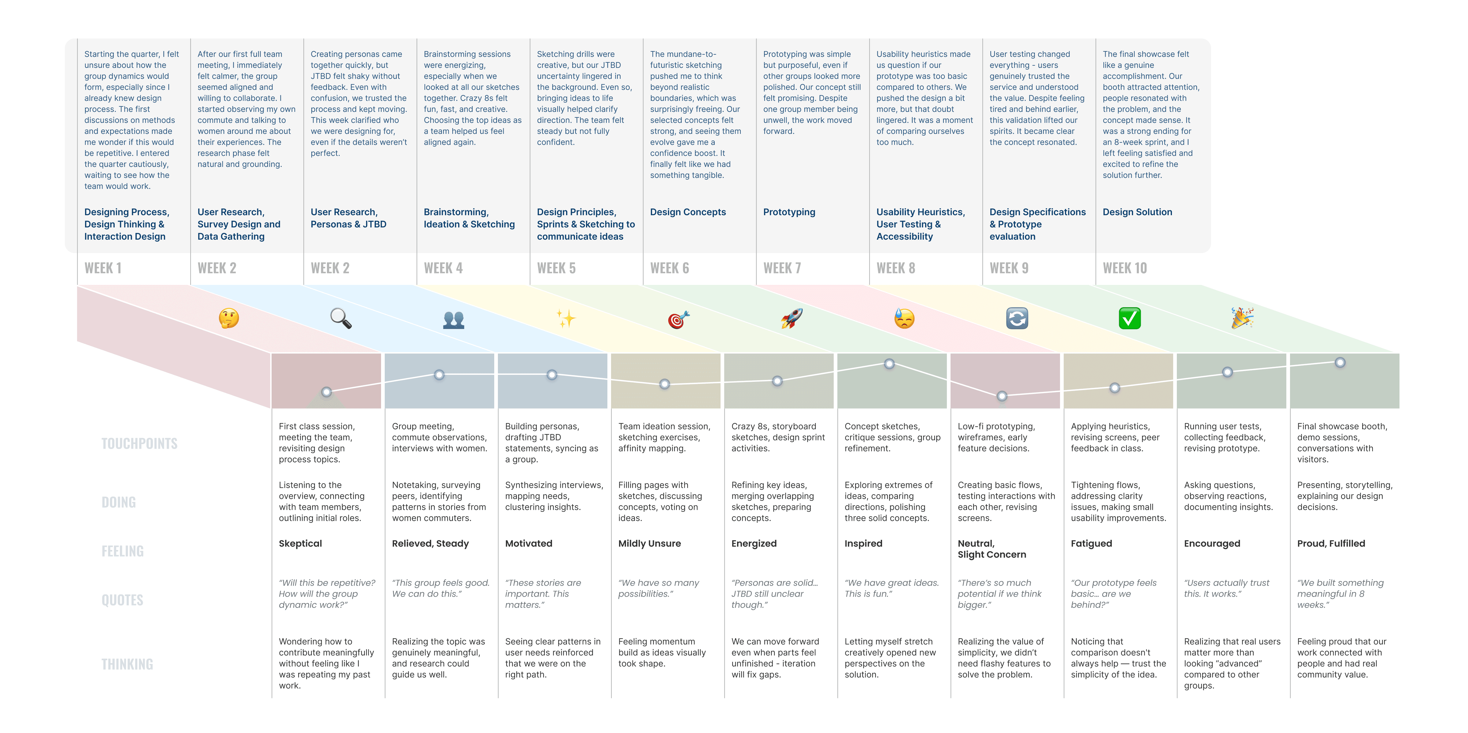 As a student in HCDE 518 working with a four-person team to research and prototype a service (Her Transit) that increases womenโs sense of safety when commuting to campus. Over ten weeks we moved from topic selection and field research, to sketching and prototyping, to user testing and a final showcase. This map traces my weekly touchpoints, actions, thoughts, emotions, and key takeaways so readers can evaluate how the course experience unfolded and where future improvements are possible.